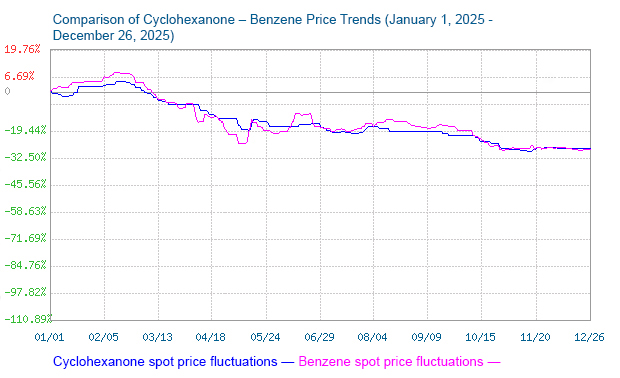 As a core raw material, benzene prices fluctuated downwards in 2025, with a significant drop in April and other periods, weakening the support for cyclohexanone prices from the cost side. Although benzene experienced short-term rebounds at times, the overall trend of weak costs remained unchanged. Cyclohexanone companies faced narrowing room for cost control and price negotiation, and the poor cost transmission further suppressed market prices.