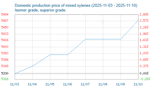 The mixed xylene market rose this week, increasing from 5330 yuan/ton to 5470 yuan/ton between November 3rd and November 10th, 2025, a rise of 2.63%. During this period, the mixed xylene market fluctuated upwards. Major refineries in Shandong raised their prices, and downstream oil blending and chemical industries replenished their inventories as needed, with relatively strong purchasing activity. The East and South China markets also saw slight increases, with major refineries in these regions generally raising their prices.