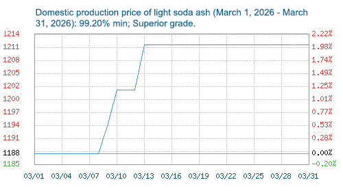 As of March 31, 2026, the mainstream market price of light soda ash in East China was around 1150-1560 yuan/ton, up 30 yuan/ton month-on-month; the mainstream price of light soda ash in Central China was around 1100-1200 yuan/ton, remaining stable compared to the previous month; and the mainstream price of light soda ash in North China was around 1220-1270 yuan/ton, up 20 yuan/ton month-on-month.