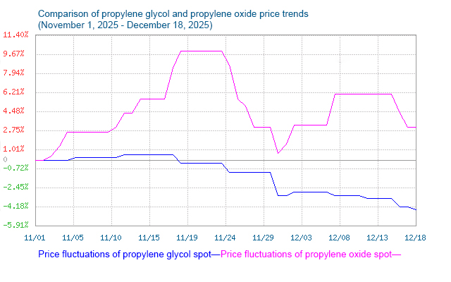 The price trend of propylene oxide (PO), a raw material, is key to influencing the cost of propylene glycol. In the first half of December, the PO market ended its previous sustained strong performance. Although the shutdown of plants such as Qixiang in Shandong initially provided a boost to market sentiment, weak demand from downstream polyethers hampered PO price increases, leading to a stalemate or even a slight downward trend. This resulted in a substantial easing of the production cost support for propylene glycol, providing producers with room to lower their prices, and shifting the cost-driven logic from “strong support” to “neutral to bearish.”
