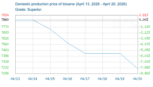 From April 13th to 20th, 2026, the domestic toluene market experienced a continuous downward trend, with prices in Shandong province falling sharply. The price of toluene in Shandong fell by 9.3% during this period. This was mainly due to a combination of factors, including weakening crude oil prices, relatively ample supply, and weak demand, which dragged down the market and resulted in a sluggish trading atmosphere and a cautious sentiment among market participants.