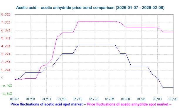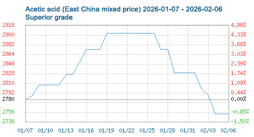 According to the market analysis system, as of February 6, the average market price of acetic acid has decreased by 76.67 yuan/ton compared to the price on February 1, a drop of 2.71%.